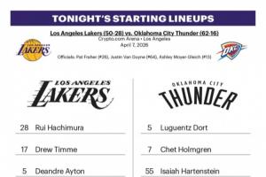 体育资讯04月08日讯 今日10:30,湖人将在主场再战雷霆。