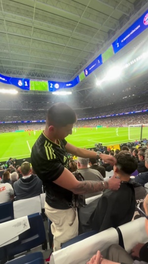 体育资讯04月08日讯 据西班牙科贝电台报道,在皇马vs拜仁的首回合比赛中,一名男子在伯纳乌看台上理发,引发了其他球迷的不满。